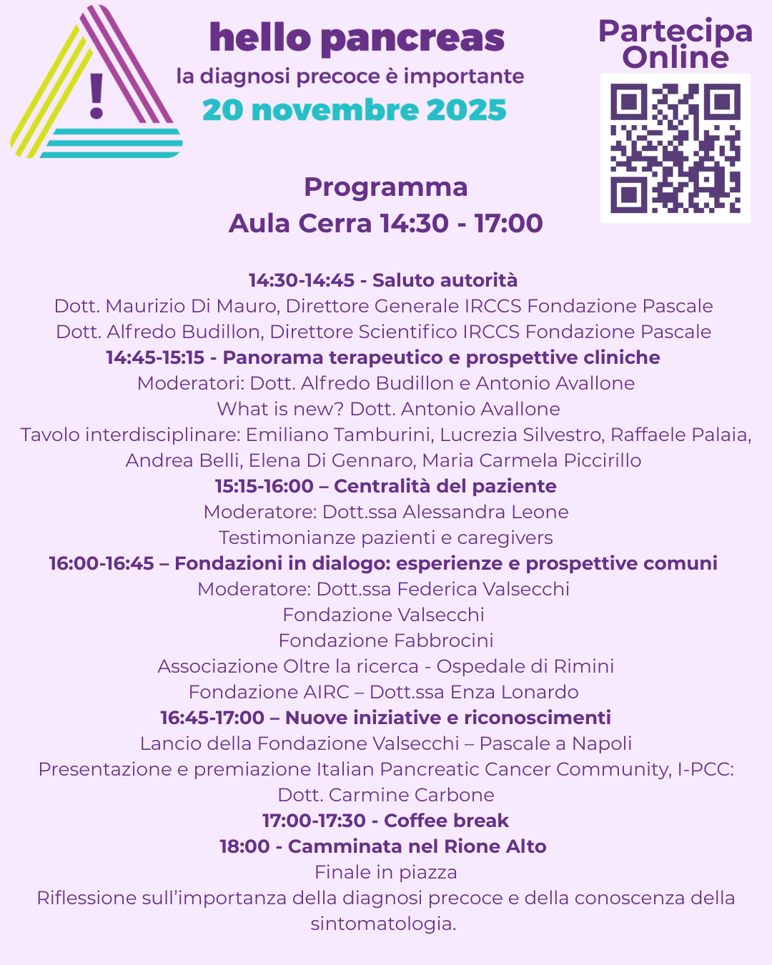 Quest’anno abbiamo il piacere di invitarvi all’incontro che si terrà a Napoli, il 20 novembre dalle ore 14:30 alle 17:00, presso l’Istituto Nazionale dei Tumori – IRCCS Fondazione Pascale.