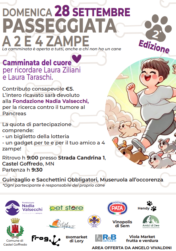 Agosto 26, 2025DOMENICA 28 SETTEMBRE a CASTEL GOFFREDO (MN), alle ore 9:30, da Strada Candrina 1 prenderà il via la PASSEGGIATA A 2 E 4 ZAMPE, un momento di incontro e condivisione dedicato a due donne speciali: Laura Taraschi e Laura Ziliani.